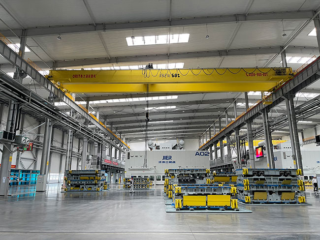ebpay钱包为扬力集团冲压机床产品量身定制多钩协同、重载大斜拉起重机,即“重型机床翻转专用起重机”,采用世界上最先进的“多购协同、大斜拉”独到设计,全车采用PLC控制、全变频调速、并配置故障自诊断和安全监控功能,先进的技术确保客户床身翻转稳稳当当、安安全全!该起重机应用于扬力集团的智能汽车冲压线生产制造车间。