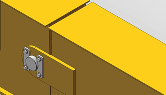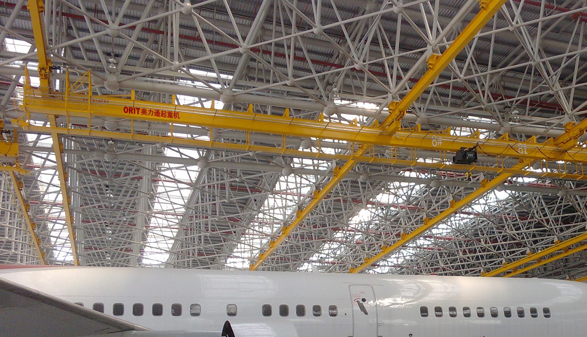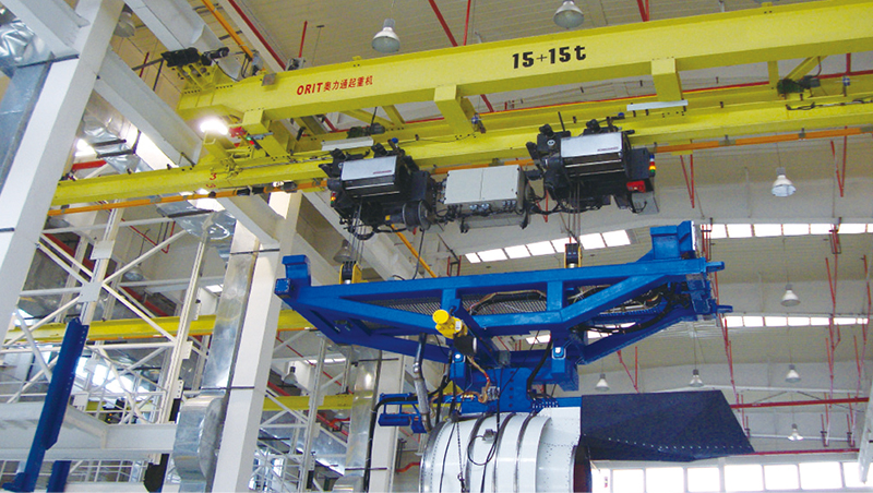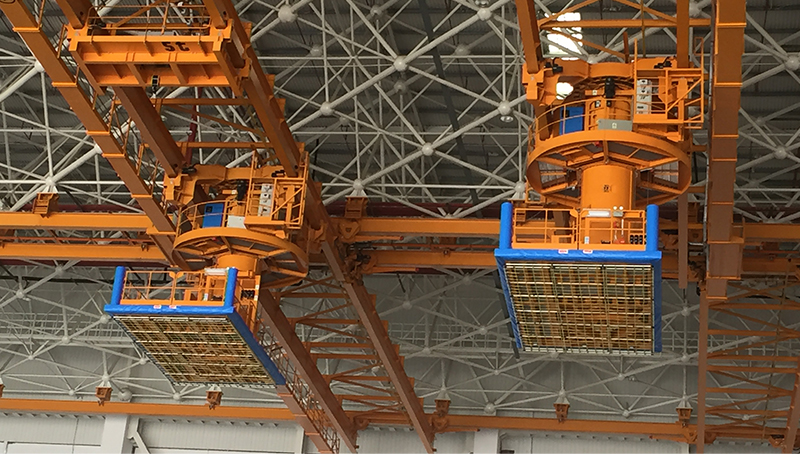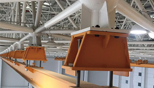 专利技术: ebpay钱包发明专利技术(ZL 2009 10143701.X)吊点新设计为“柔性吊点”,是在原来的刚性吊点基础上增加吊杆和关节球轴承的可调部分,关节球承选用自润滑型,免维护设计,吊杆选用高强特制螺杆,连接强度高,便于轨道垂直方向调节;有效减小网架变形对起重机的影响。具有水平位移自动纠正功能;具有自适应性,避免啃轨;设计简单、制作方便、成本低廉。柔性主梁可有效减小侧向应力,避免啃轨,保证运行更加平稳。
