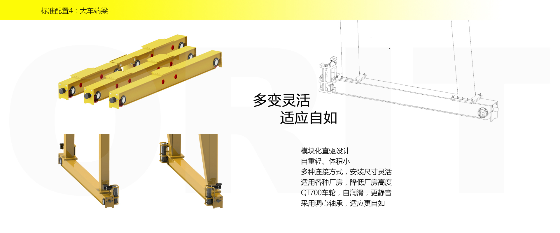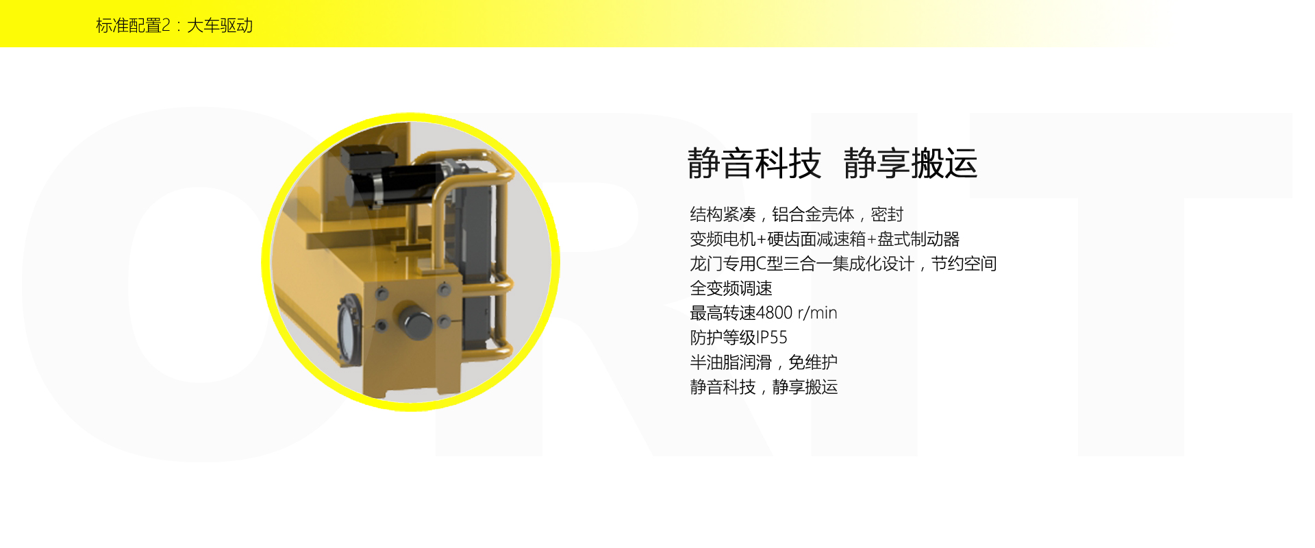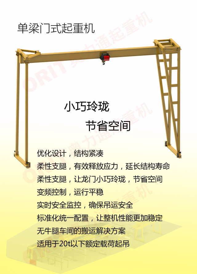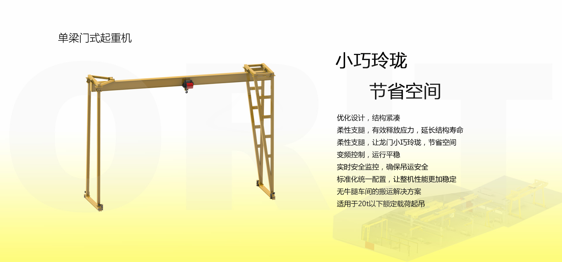 产品名称:单梁门式起重机 小巧玲珑,节省空间 优化设计,结构紧凑 柔性支腿,有效释放应力,延长结构寿命 柔性支腿,让龙门小巧玲珑,节省空间 变频控制,运行平稳 实时安全监控,确保吊运安全 标准化配置,让性能无比稳定 无牛腿车间搬运的最佳解决方案 适用于20t以下额定载荷起吊 标准配置1:起升机构 颠覆传统,自成一体 低净空设计 柔性驱动,内应力小,传动效率高 重级制电机,接电持续率60%ED 行走变频无极调速,运行平稳 自调试电磁盘式制动器,可靠,防尘 2160N/mm² 高强度镀锌钢丝绳,免维护 全周型导绳器,防松绳 全系标配安全监控系统 标准配置2:三合一驱动 静音科技,静享搬运 结构紧凑,铝合金壳体,密封 变频电机+硬齿面减速箱+盘式制动器 龙门专用C型三合一集成化设计,节约空间 全变频调速 最高转速4800 r/min 防护等级IP55 半油脂润滑,免维护 静音科技,静享搬运 标准配置3:电控系统 安全随心掌控 智能安全监控器 计算起升机构剩余安全工作时间 累计起升工作时间 累计超载次数 累计起升电机启动次数 起升电机过热保护及报警 刹车片厚度报警 ... ... 远程通讯 施耐德电气元件 航空插座接口 IP55防护等级 标准配置4:端梁 多变灵活,适应自如 模块化直驱设计 自重轻、体积小 多种连接方式,安装尺寸灵活 适用各种厂房,降低厂房高度 QT700车轮,自润滑,更静音 采用调心轴承,适应更自如 应用