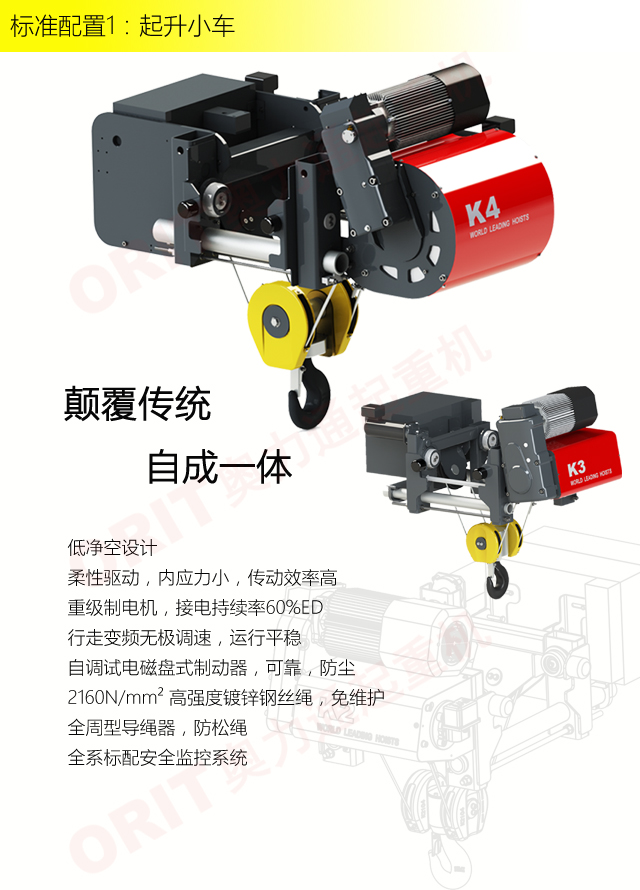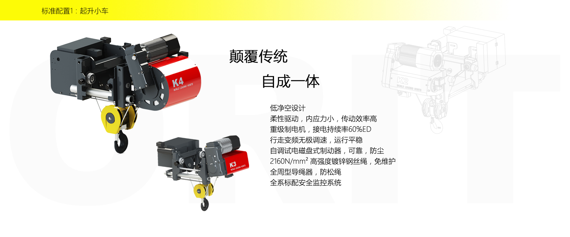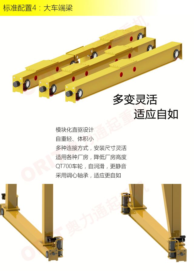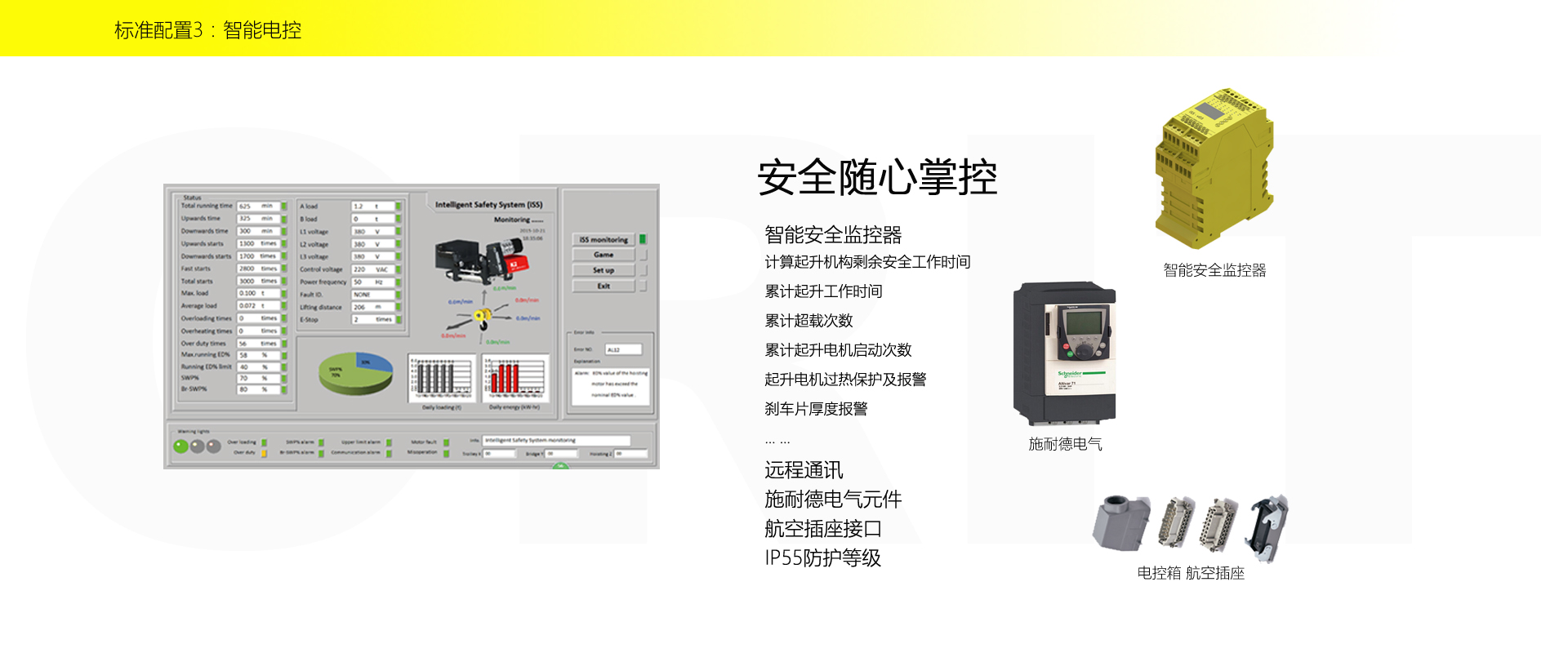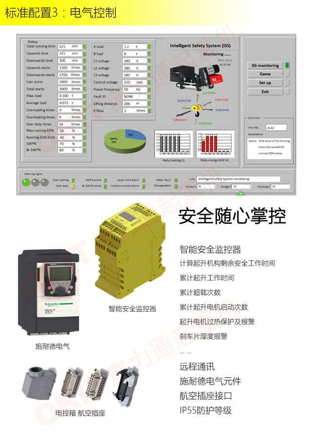 产品名称:单梁门式起重机 小巧玲珑,节省空间 优化设计,结构紧凑 柔性支腿,有效释放应力,延长结构寿命 柔性支腿,让龙门小巧玲珑,节省空间 变频控制,运行平稳 实时安全监控,确保吊运安全 标准化配置,让性能无比稳定 无牛腿车间搬运的最佳解决方案 适用于20t以下额定载荷起吊 标准配置1:起升机构 颠覆传统,自成一体 低净空设计 柔性驱动,内应力小,传动效率高 重级制电机,接电持续率60%ED 行走变频无极调速,运行平稳 自调试电磁盘式制动器,可靠,防尘 2160N/mm² 高强度镀锌钢丝绳,免维护 全周型导绳器,防松绳 全系标配安全监控系统 标准配置2:三合一驱动 静音科技,静享搬运 结构紧凑,铝合金壳体,密封 变频电机+硬齿面减速箱+盘式制动器 龙门专用C型三合一集成化设计,节约空间 全变频调速 最高转速4800 r/min 防护等级IP55 半油脂润滑,免维护 静音科技,静享搬运 标准配置3:电控系统 安全随心掌控 智能安全监控器 计算起升机构剩余安全工作时间 累计起升工作时间 累计超载次数 累计起升电机启动次数 起升电机过热保护及报警 刹车片厚度报警 ... ... 远程通讯 施耐德电气元件 航空插座接口 IP55防护等级 标准配置4:端梁 多变灵活,适应自如 模块化直驱设计 自重轻、体积小 多种连接方式,安装尺寸灵活 适用各种厂房,降低厂房高度 QT700车轮,自润滑,更静音 采用调心轴承,适应更自如 应用